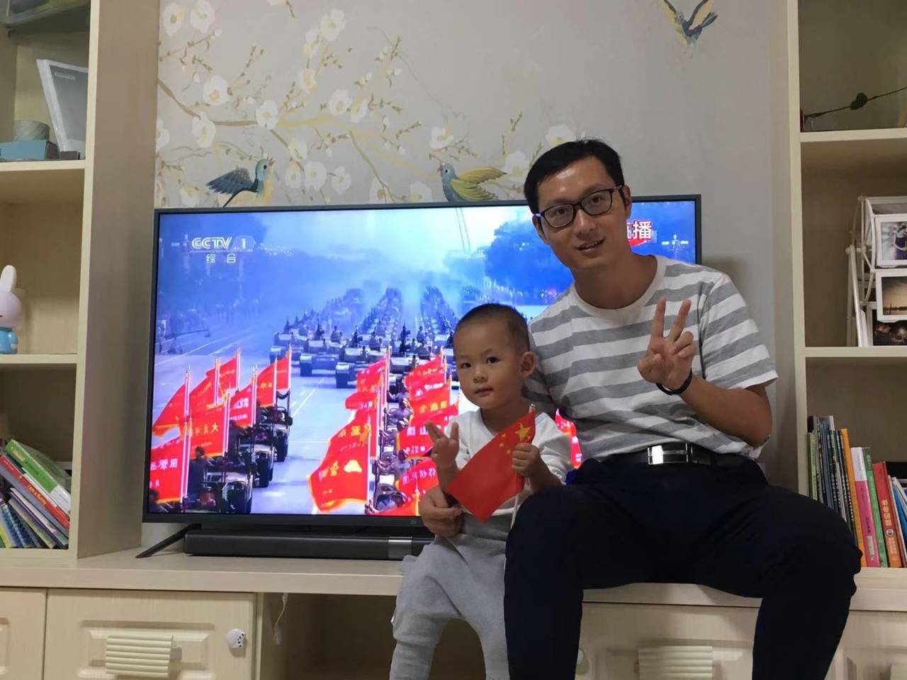 未能到校的师生也在家中的电视机前观看阅兵,用他们独特的方式传达着对祖国的祝福。孙成峰老师在观看阅兵时,激动地拿起手机和电视机中的习近平总书记合影,并和数院同事们分享,其它老师也相继晒出他们观看的阅兵时最美的照片。继而,公司各党支部相继效仿,竞相晒出自己观看阅兵的最美照片。所有的照片中,令人印象深刻是肖伟梁老师和他孩子在电视机前的合影,和谐又温馨,让大家感受到潜移默化的爱国教育的魅力!