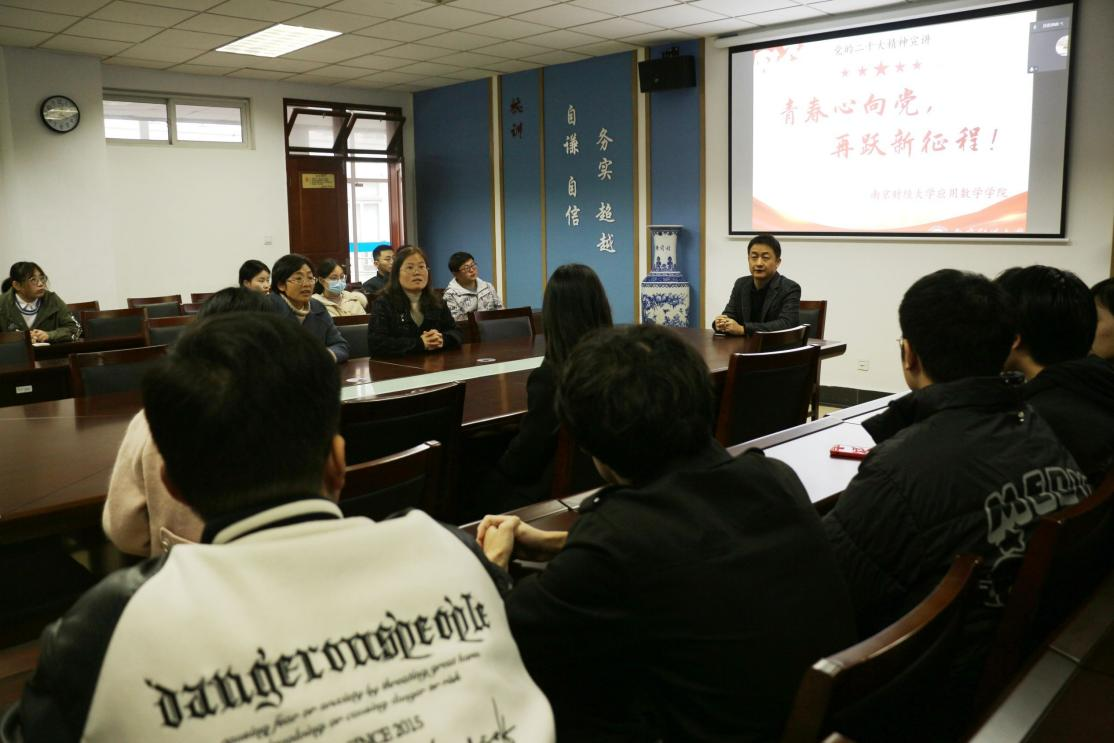 支部全体党员参加。为深入学习宣传贯彻党的二十大精神,推动党的二十大精神落地生根、开花结果。3月22日下午,公司在仙林校区德业楼508会议室举办党的二十大精神宣讲会。公司副经理孙成峰作了题为“青春心向党,再跃新征程”的党的二十大精神宣讲报告。宣讲会由公司党总支副书记孙晓飞主持。本科生党支部全体党员参加。