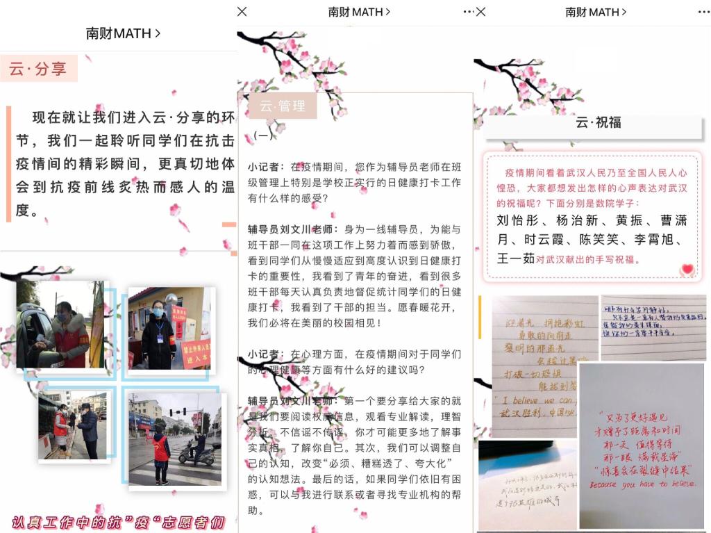 此次线上采访活动分为五个模块,即“云·分享”“云·祝福”“云·学习”“云·教学”和“云·管理”。“云·分享”主要展示同学们“宅”在家期间的生活经历。公司有五位同学参加了村内、高速口等的疫情防控志愿服务活动。其中,在小区门口做志愿者的高小涵同学认为老员工理应在特殊时期挺身而出,在村口做志愿者的龚诗钦同学则认为志愿者存在的最大意义便是为人民服务。此外,还有不少同学利用上网课外的碎片时间练字、背单词、运动打卡,更有一些心灵手巧的同学在家动手做美食。钟南山院士提出的“宅在家就是为祖国作贡献”这一观点在同学们的身上得以体现。“云·祝福”则记录了同学们对战“疫”的美好祝愿。同学们用文字、诗歌、视频等方式表达自己心中对武汉、对中国、乃至对全世界的祝福。“云·学习”记录了同学们线上学习的心得体会。同学们倡议大家应积极与老师互动,不要让网络课堂成为老师们的独角戏。“云·教学”主要围绕任课教师对线上教学的具体流程和切实体会进行采访。常微分方程刘树君老师指出,鉴于网络教学的特点,他只能“回避了艰涩的数学,但并没有回避难的数学”。为了避免高峰期网络拥堵情况,他采取了不同的应用程序教学等几套备案。教语文的刘云霞老师很早就制定好了疫情期间的教学预案以及期末考试成绩构成办法,让同学们能够提前了解到具体科目的考核标准和学习任务。“云·管理”主要通过采访公司相关老师以了解公司的疫情防控工作。经采访,同学们了解到公司成立了疫情防控小组,建立了疫情防控日报群,重点员工关心爱护群、值班群等,对于员工的健康日报打卡工作,公司不仅做到确保数据的准确,而且对数据异常情况及时跟踪,努力做好员工的思想政治教育工作和心理辅导工作等。