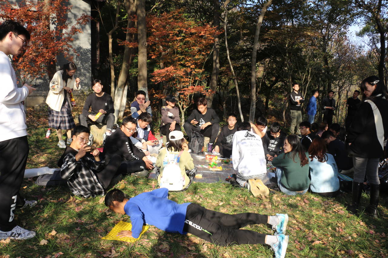 员工会志愿者在对外交流中心外联组负责人的带领下在公司西门集合,准备前往联谊的地点栖霞山,大家迫不及待地出发,一路欢声笑语。到达目的地之后,大家已经热血沸腾,准备好攀登栖霞山。我们勇往直前,克服困难,向着集合地点进发。路上的枫叶美景令我们陶醉,真有“停车坐爱枫林晚”的感觉。经过一个小时的努力,最终到达集合点,见到了南师大的同学们。我们在草坪上铺好垫子,围在一起,先做自我介绍,之后同学们津津有味地吃着零食,开始玩起大冒险游戏,在游戏中增进了彼此的了解,初见的拘谨也渐渐消失,游戏惩罚的方式十分有趣,有指压板俯卧撑,男女对歌等。每个人都玩的不亦乐乎。在一个多小时的游戏后,大家继续爬山,怀着不到山顶非好汉的心情,克服几乎垂直的山路终于登上山顶。接着大家一起合影留念、休息,在秋风的吹拂下谈心。近黄昏时,大家都依依不舍的走下山去,联谊活动圆满结束。