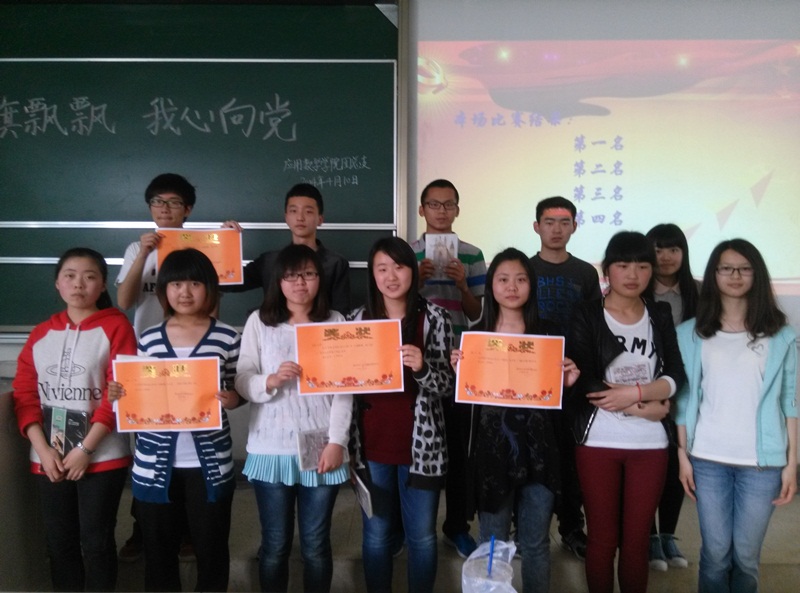 2014年4月10日星期四下午三点在专四114教室,由云顶国际yd222线路检测中心团总支主办,2012级和2013级团支部协办的“红旗飘飘 我心向党”党章知识竞赛的决赛圆满举行。 赛前,全体同学起立合唱了《红星闪闪》。接着,比赛正式开始。本次竞赛分为必答题、限时题、风险题三个环节。各代表队基准分为100分,在此基础上通过竞赛增减,比赛结束依据各队得分高低排定名次。金数1301班代表:戴元、陈璇、李响,应数1301班代表:丁沁、严硕、袁鑫,应数1201班代表:卢秀琴、赵羽浦、申新鹏,应数1202代表:丁云峰、宋利平、田步甜。 第一环节,必答题:每队每人1题,按队员场上座位顺序,从左至右,依次为1-3号队员,每题10分,答对加10分,答错扣10分;必答题按每队1-3号队员轮流作答,其他队员不得代为作答或提示,否则扣分;选手答题时间从主持人把题目读完后开始计时,不得超过20秒,超时扣分。 第二环节,限时题:各参赛队选出1名选手作答,限时60秒;在60秒限时里,答对一道加10分,其他两名选手不可提示 在严肃的比赛期间,穿插了活跃气氛的串场小游戏:首先是红歌接唱,台下观众们自愿上台,虽然有些歌曲离我们这个时代很遥远了,但还是有同学能准确接唱出来。后来是经典的“谁是卧底”的小游戏,观众们非常热情地参与游戏,最后由参赛小组中选出各代表参与游戏,申新鹏成功掩盖了自己“卧底”的身份,成为最后游戏赢家,并取得了比赛的五分附加分,而输游戏的其他选手则各自选了不同的搞笑惩罚方式,串场游戏在大家的一片笑声中结束。 游戏过后则是决定命运的第三环节,风险题:风险题分为10分、20分、30分三类,每类各6题,四支队伍抽签分成两组,一队为同组的另一队选题,若对方答对,则对方得相应分数;若对方答错,则选题的一队得相应分数。每队回答三道题;参赛队内部可在相互讨论后,选派一名选手起立作答,答完题应说"回答完毕"后方可坐下,“回答完毕”后不得再补充作答;风险题不按分值区别计时,讨论时间30秒,答题时间30秒,超时无效。 依据以上规则,比赛平稳进行,经过各班激烈角逐,应数1201班与应数1301班基本打成平手,最后应数1201班凭借小游戏中获得的五分额外附加分荣登榜首,而应数1301班紧随其后,应数1202班取得了第三的成绩,金数1301班则退居第四。 在最后,获奖班级班长上台领奖并合照,圆满的结束了本次的知识竞赛。 这是一次比较成功的知识竞赛,答题的同学和台下的观众都接收到了党组织精神的正能量,了解了党章的内容,以及党对时代的最新成果有了更多的认识,这次竞赛也培养了同学们对党的历史与精神有了更加浓厚的兴趣,成果十分喜人。