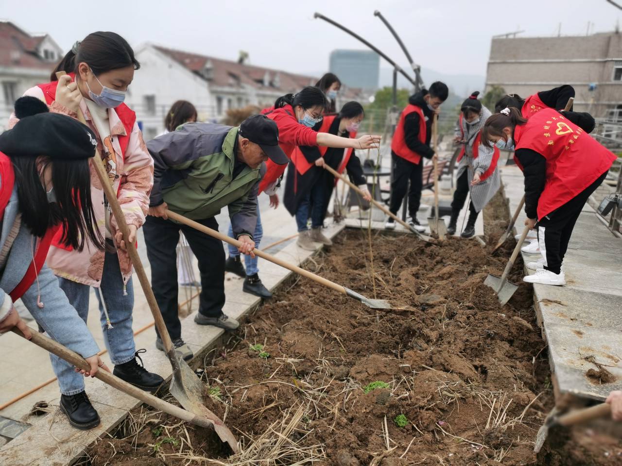 志愿者们在党员同学的带领下来到了养老院种植区,大家卸下树苗后,就热火朝天地忙活起来。“我要一棵樱花树苗”“我要一棵桃树苗”“我要一棵桂花树苗”……大家开始了挖树坑、扶树苗、培土、浇水等一系列劳作,经过一番紧张的劳动,一排排新栽下的树苗昂然挺立,在和煦的春风中展现出勃勃生机。烟雨蒙蒙之处,尽是同学们的欢声笑语,正可谓“种桃种李种春风”,别有一番景象。
