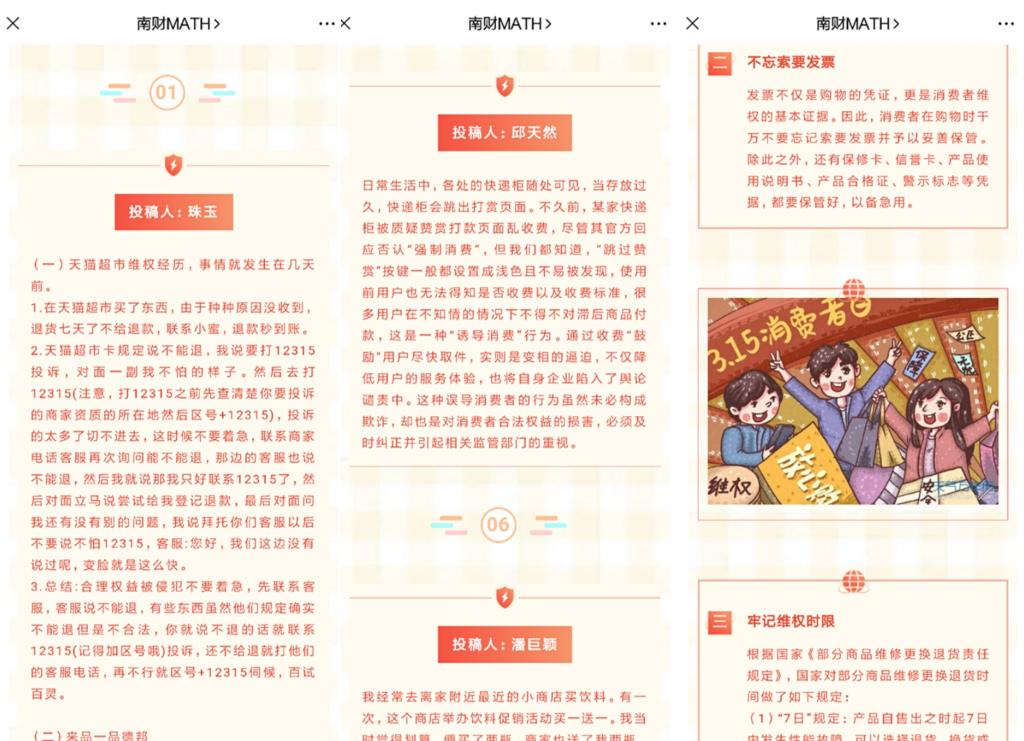 从投稿的小故事中可以看出,每一位同学都有自己印象深刻的消费者经历。可能是被无良商家欺骗,或者是因为缺少发票这项重要凭证而被商家钻牛角尖,甚至是不法分子进入校园诈骗。同学们都选择将自己的亲身经历大声说出来,让更多的人注意到缺少维护消费者权益意识而引发的严重问题。有些投稿的同学还贴心地在小故事末尾为大家总结作为消费者需要注意的事项,希望大家引以为戒。