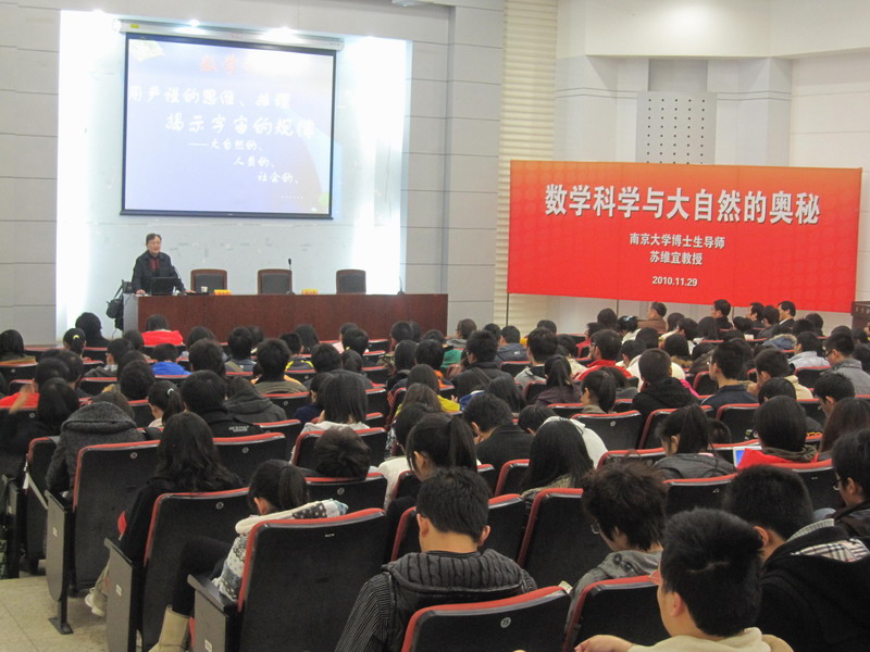 11月29日晚18时30分在公司专一报告厅举行了主题为“数学科学与大自然的奥秘”讲座。本次讲座由南京大学博士生导师苏维宜教授主讲,公司张从军经理,陈益茂书记,学工秘书老师龚莉红,辅导员李迅均出席此次讲座,并对苏教授的到来表示了热烈的欢迎。