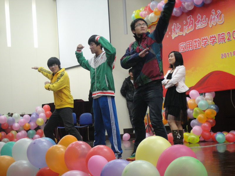 第三乐章——欢乐一家亲将晚会推向了高潮,男生302宿舍为我们带来了集体舞《大爱302》,由濮阳腾飞、闵济康等人倾情奉献,他们在结婚进行曲的伴奏下两两上台,引起台下欢呼阵阵,他们先是跳起了可爱的波斯猫舞蹈,接着又跳起了经典的nobody,他们到位的动作,可爱的表情让大家忍俊不禁,欢笑声连绵不绝。最绝的,还要数他们的“千手观音”表演,他们默契的配合和到位的表情获得了满堂彩,大家纷纷拿出相机拍下这一经典的画面。相声《胡椒面》是许多人眼中的经典,今天,高正扬、高任、贾芸芝同学重新为我们演绎了这一段经典,高正扬和高任生动的动作,传神的表情又让整个会场充满了笑声。曾获得应数公司“十佳歌手”赵元琨学长为我们带来了一首《can you feel my world》,他充满磁性的嗓音感动着我们每一个人。压轴节目华尔兹《原来你也在这里》由吴弘、秦川等5组同学为我们带来,他们让我们感受到应数学子们的风采,朝气和活力,整场晚会在他们的鞠躬后,在《难忘今宵》的歌声中完美结束。