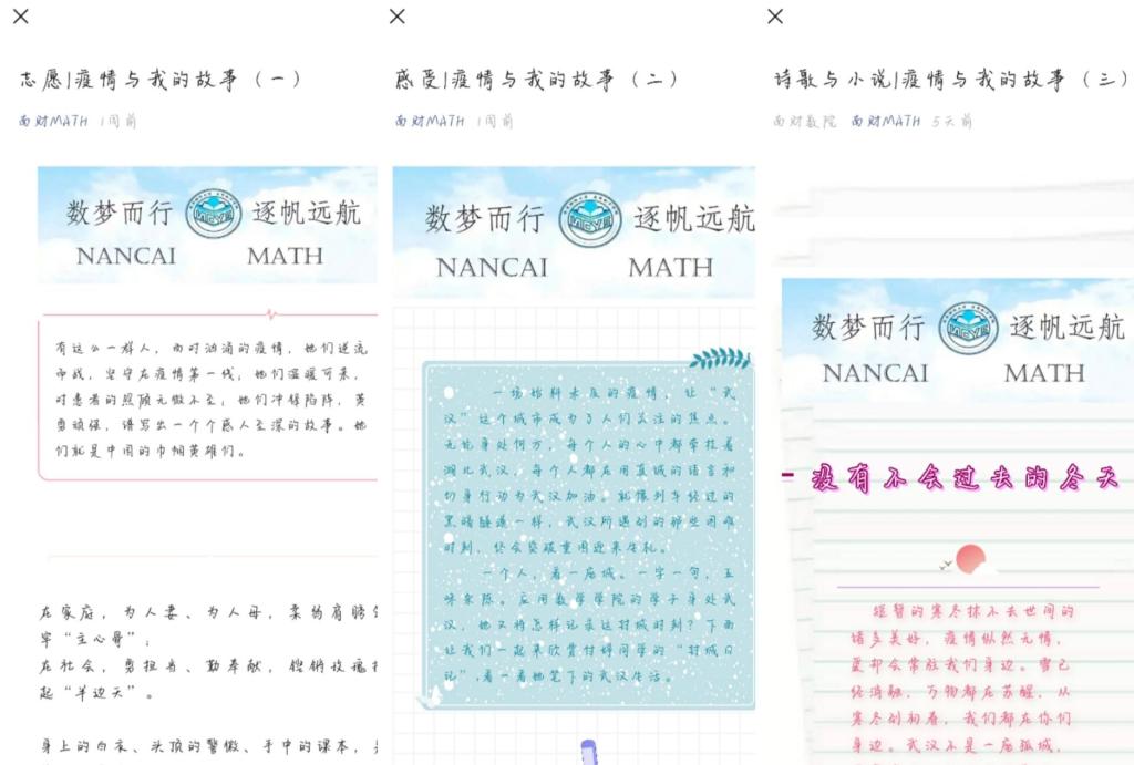 活动共分三个主题:“志愿”“感受”“诗歌与小说”。在“志愿”主题中,公司五位学子分享了自己在疫情中担任社区志愿者的经历,讲述了志愿服务过程中的收获和感悟。他们每日参与并协助所在社区进行疫情防控工作,包括核验身份、测量体温、监督车辆、扫码登记等等,日子虽忙碌却充实,让他们感受到了付出的幸福,更因大众的齐心协力而自豪。在“感受”主题中,身处武汉的付婷同学在公众号上分享了自己的生活,写出了自己的心路历程。她用日记的形式描述了一个普通人在疫情逐渐恶化,又重获健康的一点一滴,记录了武汉封城以来各方面的变化与自己的生活情况,并为家乡加油打气。在“诗歌与小说”主题中,同学们通过文字抒发内心对疫情工作者的感情。童姚、汪榆、曹潇月等同学分享了自己创作的诗歌与小说,其作品反映了疫情期间人们的默默付出与无私奉献,表达了对前线抗“疫”战士的祝福、对国家能够早日度过这次疫情的希望。