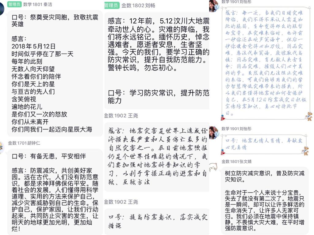活动内容是年级各班级发表一个口号或者小图片,以及一段感言。大家的感言都十分牵动人心,今年的5月12日是汶川地震十二年天灾无情,人间有爱。大家的感言中都饱含着时间抚慰伤痛,也见证重生的情感。也有班级的感言是缅怀逝者,致敬重生的。其中有许多感人肺腑的感言和口号,金数1901班感言是这样的“在自然灾害面前,即便是在科技发达的今天,我们或许也有无法逃避的时候,大人们的心总是连在一起的,无论是四川地震还是汶川地震还是玉树地震,全国人民的关怀总是不间断,全国人民的援手总在温暖着我们的心窝。人性的温暖真实,永远不会停下发热发亮。这些光和热会聚在一起,成为一束冲破一切的光。”还有金数1701的感人口号“有备无患,平安相伴”。