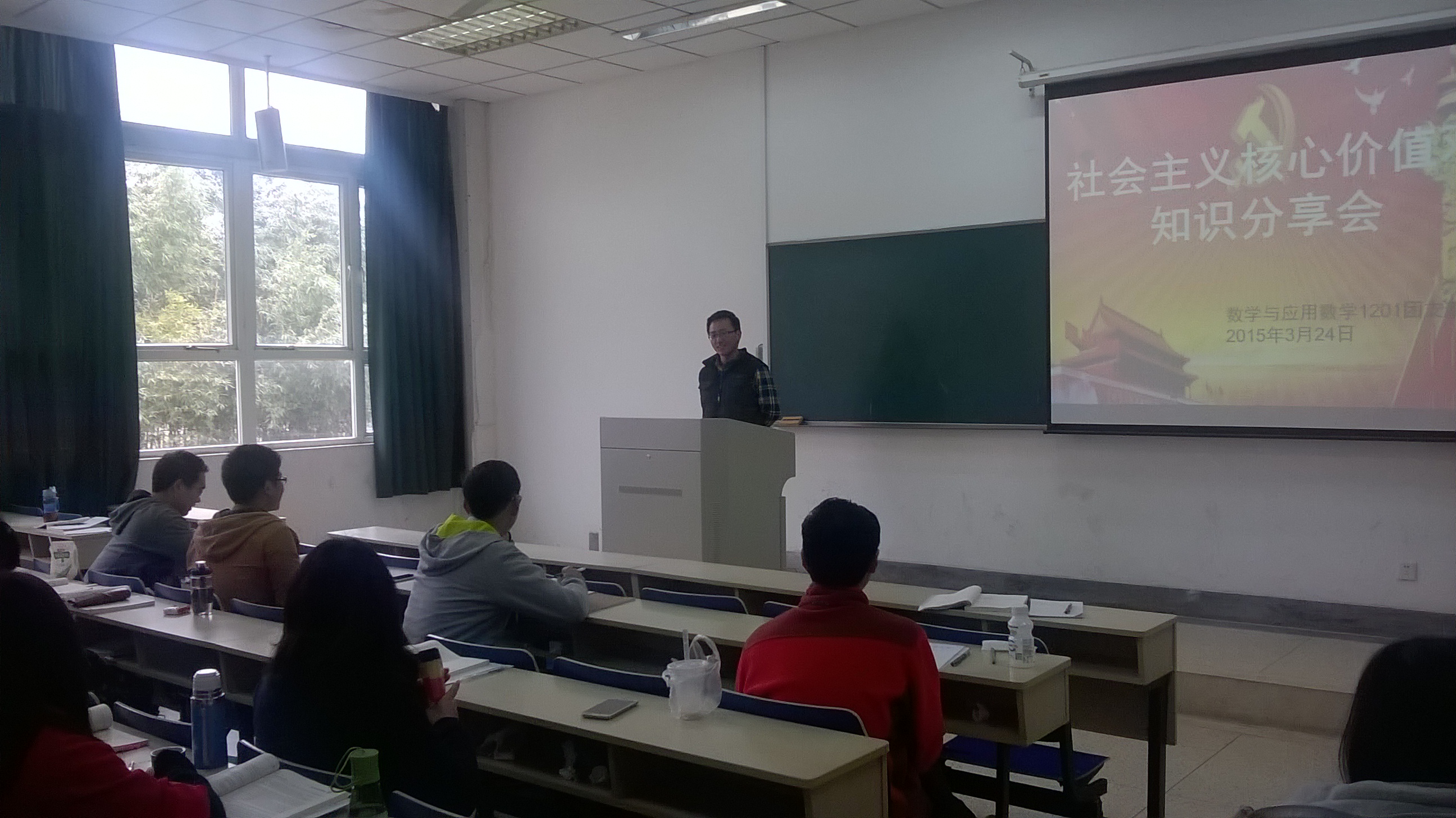 2015年3月24日上午,云顶国际yd222线路检测中心数学1201班团支部在云顶国际yd222线路检测中心仙林校区专四—104教室举办社会主义核心价值观知识分享会,该支部全体团员积极参与,会场热情洋溢。分享会由团支书万雯同学主持,她率先为大家讲解了社会主义核心价值观的内容。富强民主,文明和谐是国家层面的价值目标,自由平等,公正法治是社会层面的价值取向,爱国敬业,诚信友善是公民个人层面的价值准则。 接着由党员谢启阳同学为大家讲述个人的经历,谈谈自己是如何入党的,光荣入党后如何在党的号召下,积极践行社会主义核心价值观。他认为,我们的目标不仅仅是努力学习,还要做到心系天下,关心国家。我们很快就要步入社会,在这之前,学习当然是最重要的,但是我们不能局限于书本,要试着融入社会,要把书中学到的知识活学活用,做一个将来对社会有贡献的人。谢启阳的发言对其他同学有很大的启发,让大家入党的热情高涨,台下议论纷纷,对于如何践行社会主义核心价值观畅所欲言。也有同学提出了一些关于核心价值观的问题,谢启阳給予了详细解答。预备党员裴相烨同学也分享了一些关于她个人对社会主义核心价值观的理解和思考。接着其他同学从各自的角度谈了对社会主义核心价值观的理解以及在学习生活中如何践行。通过此次活动的开展,数学1201班的团支部同学,思想上有了方向,行动上有了动力,为进一步深入践行社会主义核心价值观打下了良好的基础。