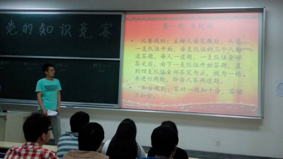 参加此次竞赛的共有四支队伍,分别是金数1301,数学1301,金数1401和数学1401,每队由三人组成,竞赛分为五个环节,分别是车轮战、限时赛、抢答、你画我猜、听曲识歌。此次活动旨在进一步加强基层组织建设,让同学们在轻松愉快的氛围中学习党的历史、基本理论和知识,增加同学们对党的热爱。