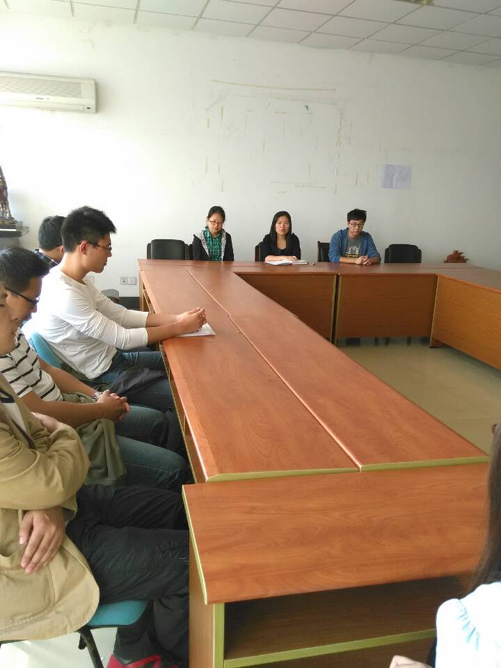 接下来,龚老师向我们介绍了本次会议的主要内容。主要有三点:第一,学习党的十八届四中全会内容;第二,关于“研本手拉手”活动的开展,主要就是让研究生晚自习时间帮本科生答疑,从而让本科生更好地学习,这个活动得到了同学们的积极响应;第三,关于本周六举行的教职工羽毛球大赛的志愿者活动;第四,各位研究生党员交流了自己学习和生活近况。