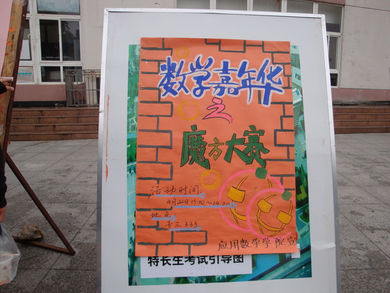 首先开展的是趣味答题。一块展板,n多写着题目的纸条,奖品“真知棒”,虽说规模不大,奖品不丰厚,但趣味数学本身的魅力却也成功的钓足了同学们的“味口”,引来很多同学驻足观看,有些蹙着额头在算着什么,有些两两的讨论着,有些甚至拿起手机开始百度搜索。可能是看到同学们都来看,连外教也来凑凑热闹。虽然不是太懂中文,经过工作人员的翻译,外教却也答出了题目,赢得了奖品,心满意足的露出了笑脸。趣味数学题一反数学的枯燥,展示了数学趣味性的一面。