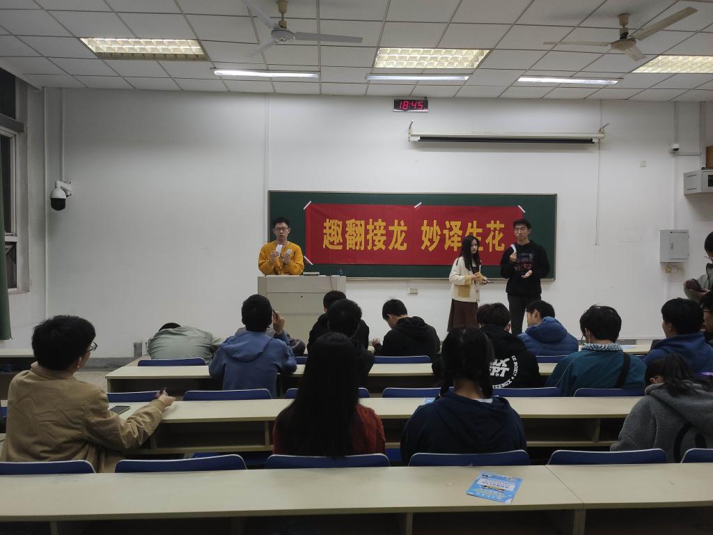 在全国四六级英语考试即将到来之际,为提升同学们的英语书写、表达及翻译能力,11月20日晚,云顶国际yd222线路检测中心员工会文化传播中心文艺组在德业楼106教室开展主题为“趣翻接龙,妙译生花”的趣味英语交流活动。