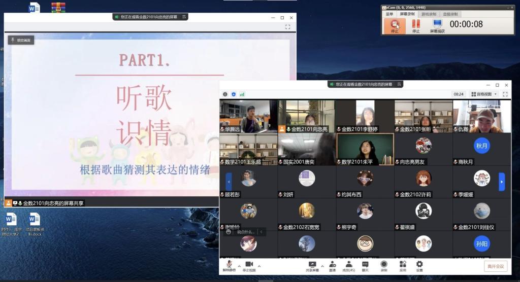 听歌识情环节,要求参与者分享类似情绪的歌曲,欣赏完曲目的同时,体会歌曲所表达的情感价值。轻松欢乐的《开心超人》主题曲作为开场,一下子把大家带回到童年的回忆。张子轩同学分享了五月天演绎的激励又充满勇气的《玫瑰少年》,朱平同学分享了安慰他人、即使忧伤,也要充满自信和欢乐的披头士乐队的《hey jude》。同学们积极分享自己的看法和歌曲,有人把简单的快乐和童真当作幸福,有人认为勇气和自信对于强大内心必不可少,有人则拿出自己的歌单分享自己收获的快乐。睹情表意环节,要求参与者看到核心情绪词汇后,能想到对应的歌曲,并且愿意哼唱或者分享。活动为大家准备了四个核心情绪词汇:欢快、忧愁、深情和激励。商秋月、熊宇奇等同学开麦哼唱,不仅点燃了气氛,得到了在场观众阵阵喝彩,更调动了大家积极参与和分享的意愿。