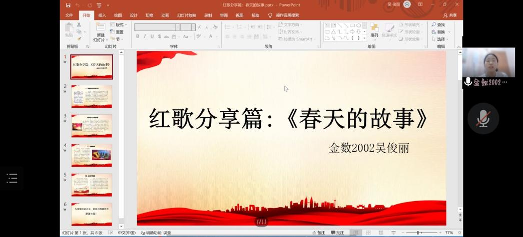 在主持人开场介绍了交流会流程,表达了对八一建军节的衷心祝愿后,各班代表按依次进行红歌分享。分享者们通过ppt展示,介绍红歌背后的故事、写作背景,共同赏析红歌的歌曲内容。伴随着一曲曲红歌映入耳蜗,同学们渐渐融入,仿佛置身于那个时代,感受解放军们的团结奋进、勇敢拼搏的精神。欣赏过后,分享者根据自身体会对歌曲背后红色故事的意义及内涵进行深入讲解,发表个人感想,表达对中国军人的赞美。最后,主持人讲述的对未来生活的美好期盼为此次红歌交流会画上了一个完美的句号。