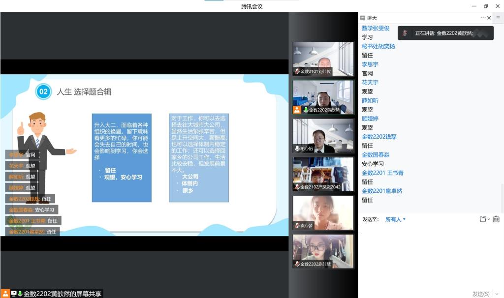 人生是选择题合辑。无论是中考时面对的文化课与直升考试,还是填报志愿时两个反复纠结的专业,人生总是一个又一个十字路口。柏心怡同学提出了老员工活中会遇到的选择并发出灵魂拷问,引发了大家对老员工活进行思考。选择并不可怕,也不需要过度纠结,了解自己的需求并对每一个选择会带来的后果进行充分预估,学会正视自己的选择,那么无论是学习还是生活都会无比精彩。