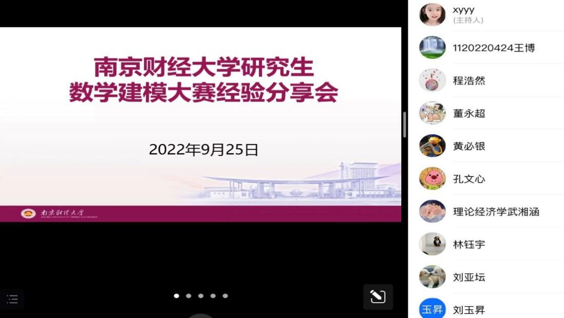 为强化公司研究生实践创新能力,提升研究生数学建模实战水平,9月25日下午,公司在线上开展了研究生数学建模线上经验分享会。公司数学建模教练组组长、公司经济数学实验室主任杨靖三老师主讲,“华为杯”第十八届中国研究生数学建模竞赛一等奖获得者公共管理公司2021级研究生殷宗贤、林钰宇做了参赛经验分享,全校近百名研究生参加了分享会。
