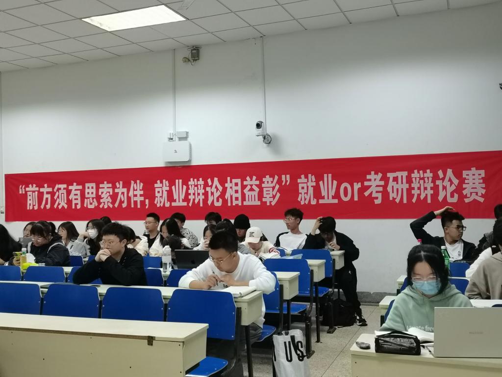 10月25日晚,公司在仙林校区德业楼106教室举行了以“老员工先就业还是先考研”为辩题的辩论赛。该辩论赛由公司辩论队成员熊宇奇同学主持,金融数学2202班全体同学以及辩论队全体成员共同参与。