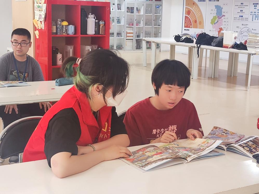 活动中,志愿者向中心的学员捐赠了绘本、故事类图书73本,向中心工作人员捐赠艺术、生活类期刊47本。内容丰富、种类繁多的书籍承载着志愿者对学员和中心工作人员的深情关爱,很多学员在拿到书籍后就迫不及待地开始翻阅,志愿者们趁机也加入到阅读行列中,志愿者们用心用情专注的阅读将学员拉入到跌宕起伏的故事情节之中,大家的目光追随着志愿者,手中捧着的书本成为彼此心灵互动的桥梁,每个人都沉浸在书本中,陶醉在美妙的故事情节里。最后,志愿者和学员一起拿起画笔为线稿上色、绘制图画。一笔一划,一临一摹,在志愿者的帮助下,一个个活灵活现、五颜六色的卡通人物呈现在学员面前,让他们觉得无比新奇又充满自豪。活动接近尾声,志愿者和学员们合影留念,并向学员们致以真诚的祝福。