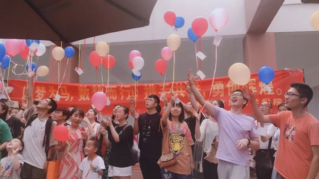 接着,大家移步德业楼六楼举办了以“开启大学之门小欢喜,放飞青春梦想大未来”为主题的放飞气球活动,邀请2019级新生及家长共同参与,希望能给他们送上梦想的航标,自此扬帆起航。活动在悠扬的乐声中开始,家长和孩子们在草坪集合,大家精心挑选了各色各样的梦想气球,窃窃耳语者有之,欢声笑语者有之,默想沉思者亦有之,气氛一片欢乐祥和,或大或小的梦想就在爱与希冀中诞生。孩子们拿着气球许下对大学四年亦或是更遥远的未来的愿望,用记号笔小心翼翼地将梦想写在气球上,家长们则是满脸笑意看着即将离开却尚未脱离稚嫩的孩子,眼神流露出的无一不是担忧与不舍,同时也隐含期盼与祝福。当色彩缤纷的气球一个接一个飞上天空的瞬间,天空仿佛被彩虹色点亮了,那是梦想绽放的光华,是孩子们走向未来的开始。 小小的气球承载着大大的梦想,飞向遥远的未来等待着被实现的那一天。活动虽已结束,但梦想依旧,相信未来可期。