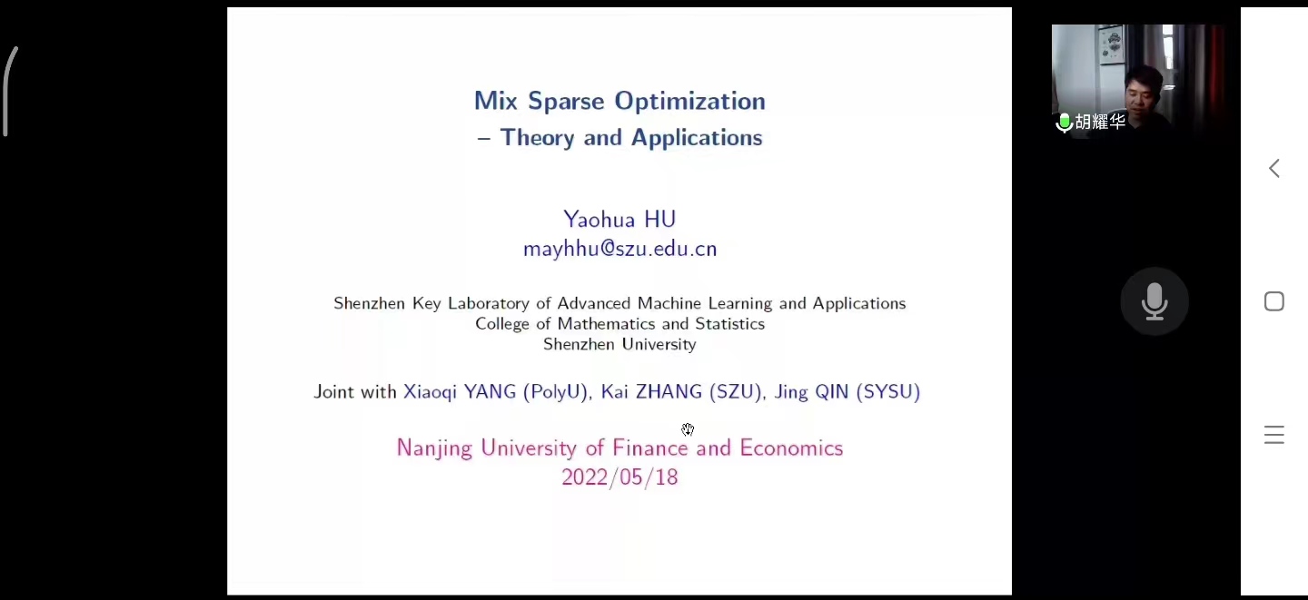 5月18日下午,应云顶国际yd222线路检测中心邀请,深圳大学胡耀华副教授通过腾讯会议作了题为“混合稀疏优化:理论与应用”的线上学术讲座。公司硕士研究生、部分教师参加了此次讲座。