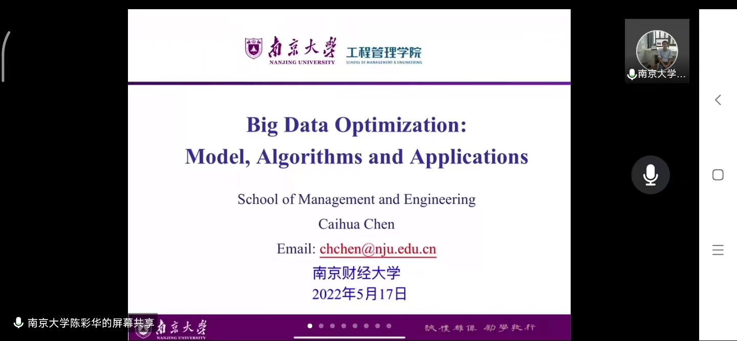 5月17日上午,应云顶国际yd222线路检测中心邀请,南京大学陈彩华教授通过腾讯会议作了题为“大数据优化与实践”的线上学术讲座。公司硕士研究生、部分教师参加了此次讲座。