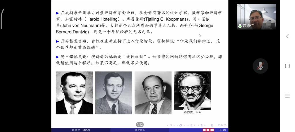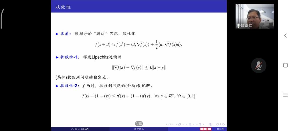 韩德仁教授首先介绍了经典数学优化理论的基本概念,包括线性、光滑性、凸性等。这些“好”性质是对数学优化模型进行分析的基本假设。韩德仁教授进一步指出,现实的优化问题,尤其是机器学习等热门应用领域中的优化问题,如深度神经网络等问题,往往是非线性、非光滑、非凸的,这使得对其分析求解面临很多挑战。韩德仁教授最后总结了一些机器学习、人工智能等热门研究领域中非 凸优化问题的特性,介绍了处理非凸优化问题的几种常用方法。