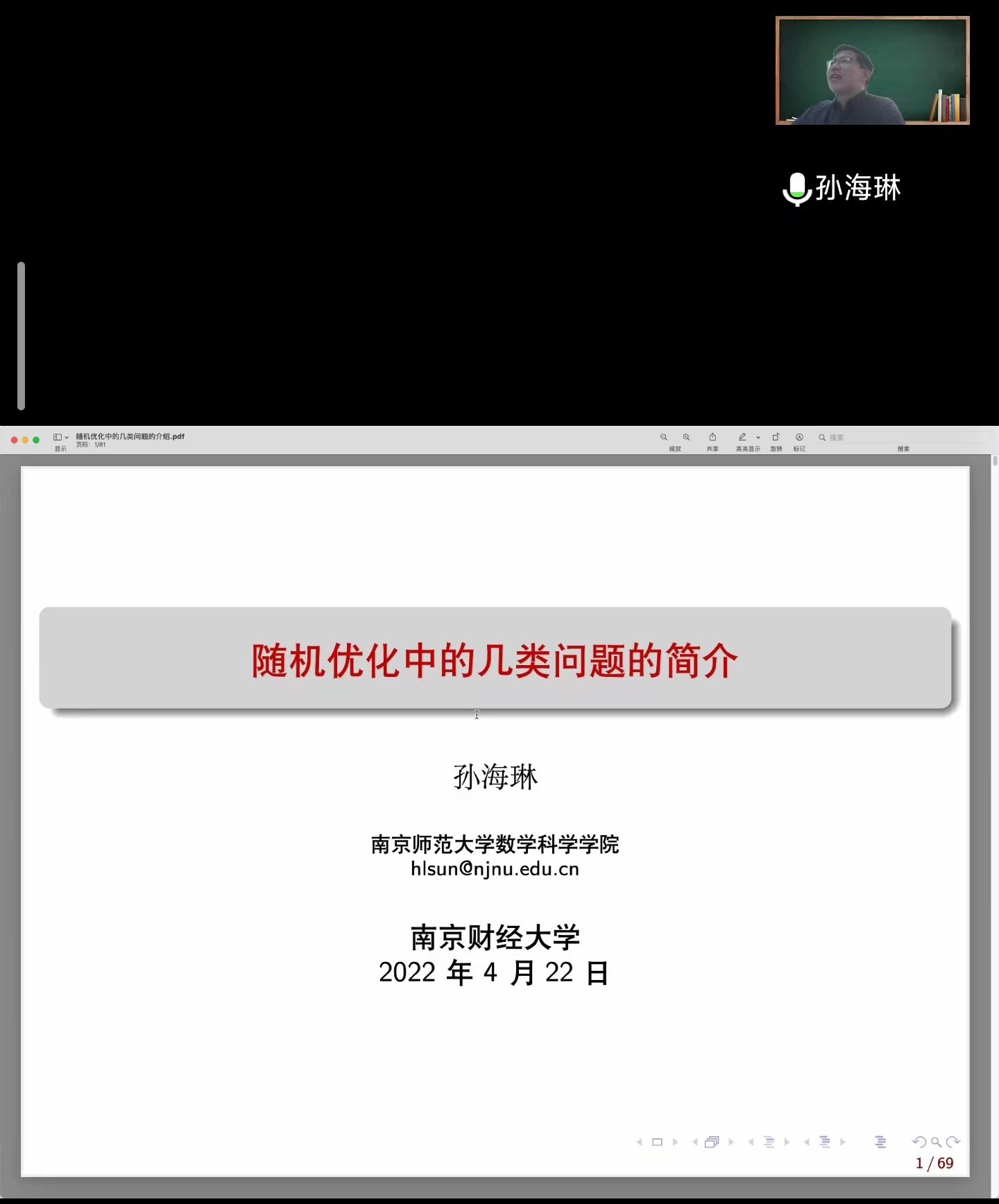 4月22日下午,应云顶国际yd222线路检测中心邀请,南京师范大学孙海琳教授通过腾讯会议作了题为“随机优化中的几类问题的简介”的线上学术讲座。公司硕士研究生及部分老师参加了此次讲座。