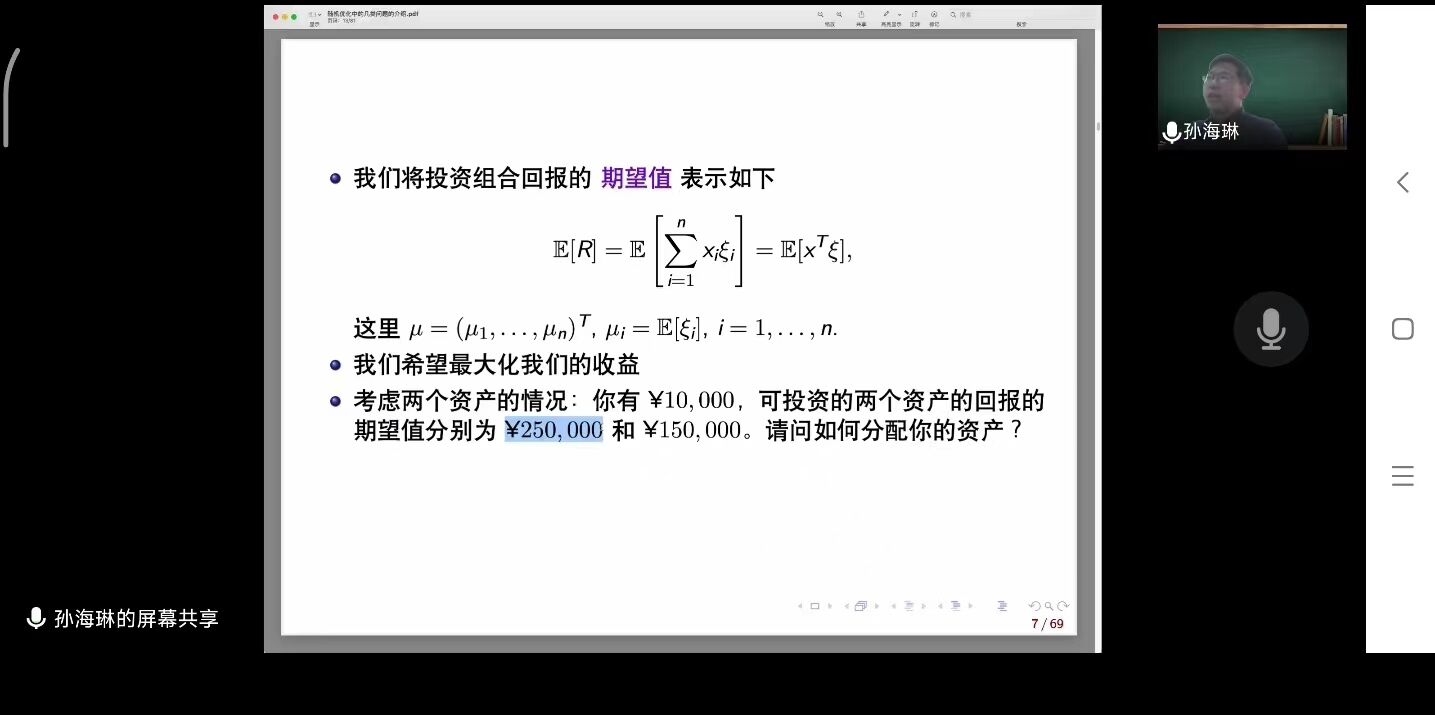 孙海琳教授首先介绍了随机优化的概念和在金融、管理、交通、机器学习等领域的若干应用。孙海琳教授进而介绍了随机优化的几种常见模型,包括风险规避的随机优化、机会约束优化、两阶段随机优化、分布鲁棒随机优化、随机纳什均衡问题、随机变分不等式问题等,并通过若干实例展示了如何使用这些模型分析实际问题。会后,孙海琳教授和参会人员展开了交流,效果良好。