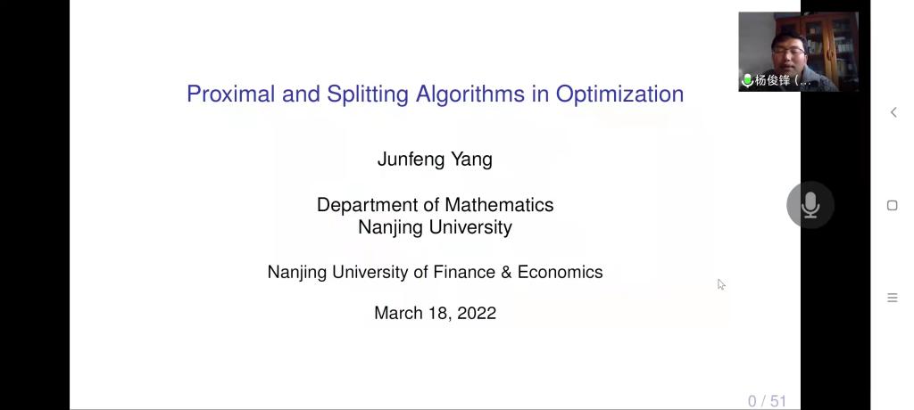 3月18日下午,应云顶国际yd222线路检测中心邀请,南京大学数学系杨俊锋教授在线上作了题为“A Brief Introduction to Proximal Splitting Algorithms”的学术讲座。公司硕士研究生及部分教师参加了讲座。