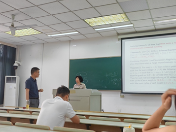 在报告中,彭岳建教授介绍了图的二部Ramsey数的定义和相关进展,尤其是圈和联通匹配的二部Ramsey数,分享了它们在最小度条件下取得的结果,并讲解了研究该方向的一个重要工具—正则引理。王毅教授介绍了组合中的Sperner理论,尤其是著名的LYM不等式和偏序集中的匹配问题,该理论主要是利用代数技巧解决问题,并在最后提出了一些很有研究价值的新问题。此次报告提升了师生们的学术水平,开阔了科研视野,极大的促进了青年教师和研究生对科研工作的热情。