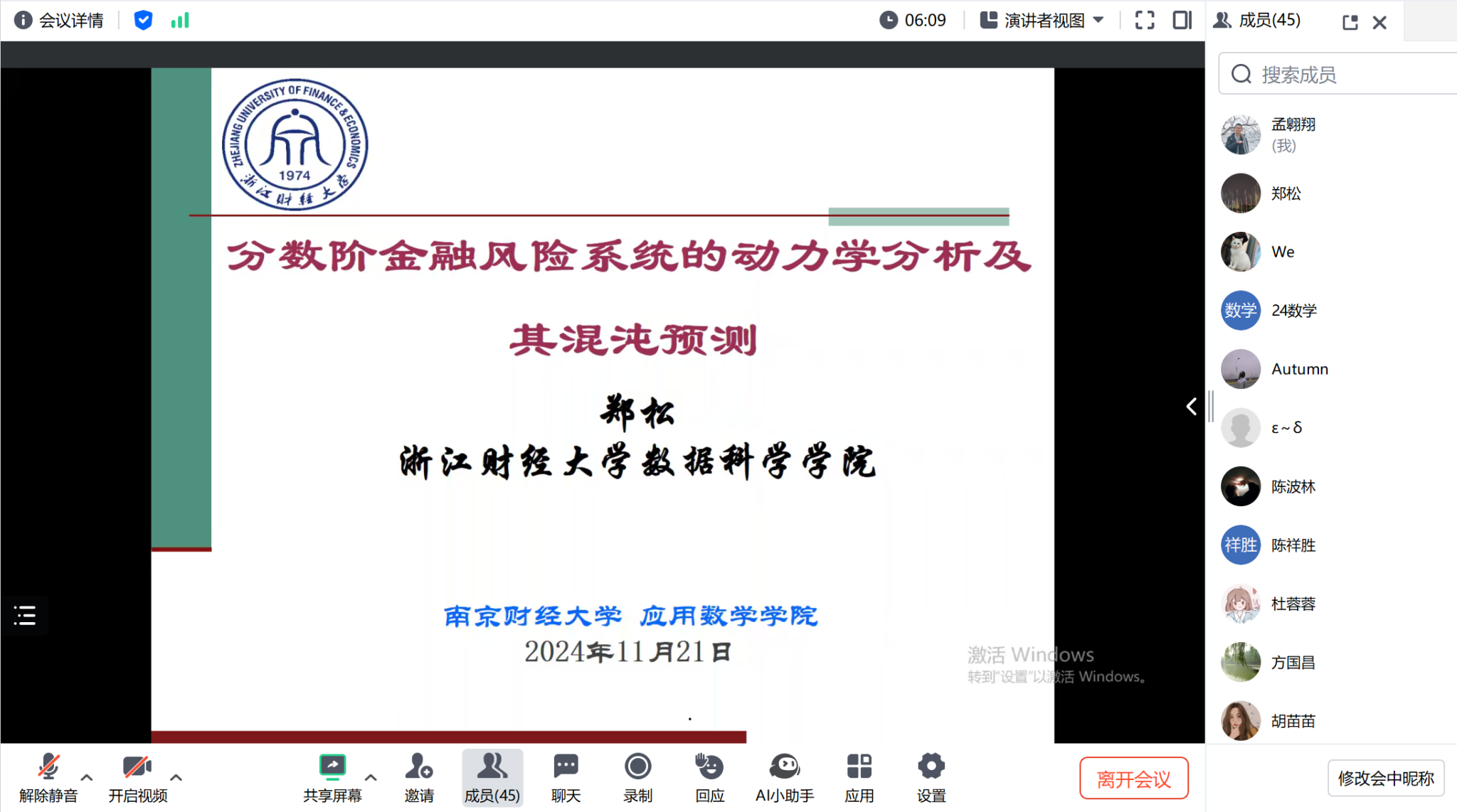 11月21日,应云顶国际yd222线路检测中心邀请,浙江财经大学郑松教授通过腾讯会议作了题为“分数阶金融风险系统的动力学分析及混沌预测研究”的学术讲座。云顶国际yd222线路检测中心相关教师、研究生和其他公司感兴趣的研究生参加了这次讲座,讲座由云顶国际yd222线路检测中心经理方国昌教授主持。