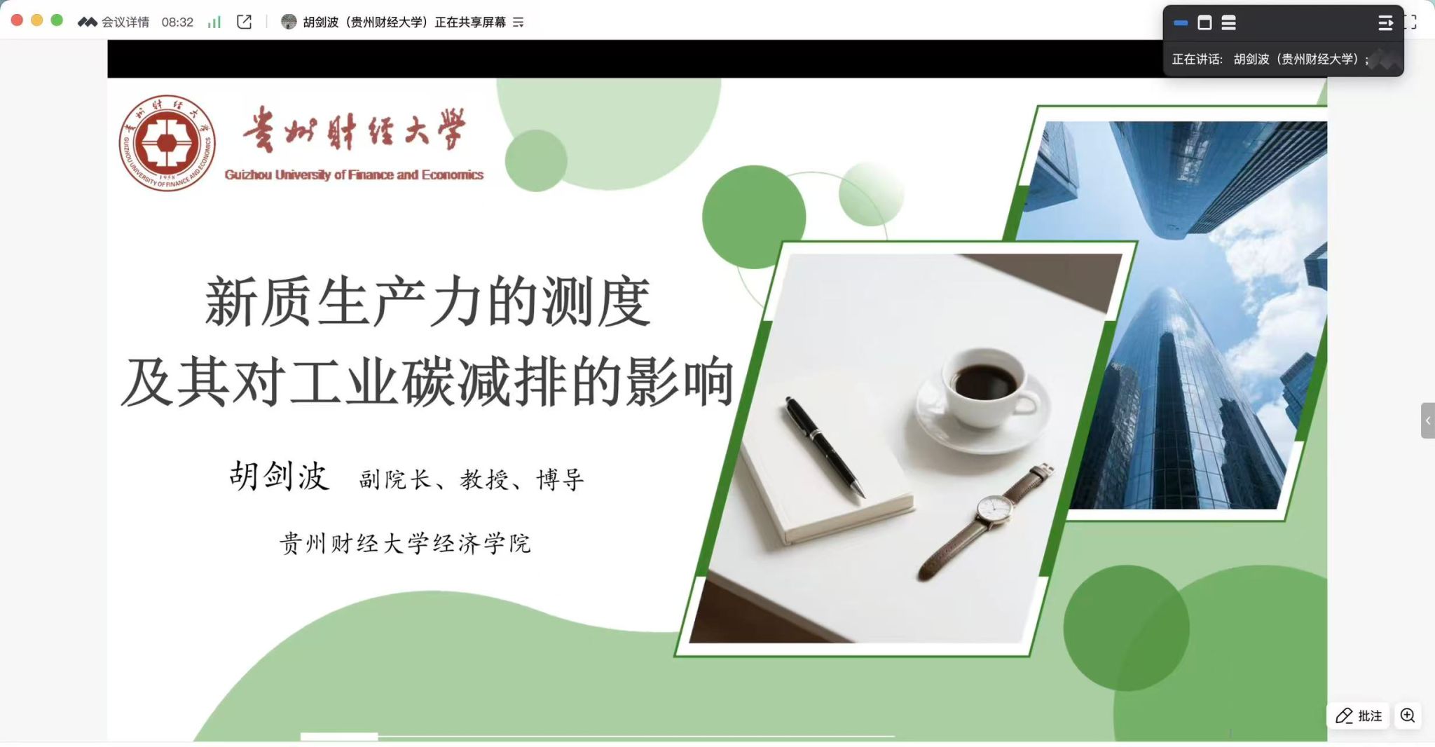2025年10月13日,公司邀请贵州财经大学经济公司副经理胡剑波教授为师生做了题为“新质生产力的测度及其对工业碳减排的影响”的线上学术报告会,报告由云顶国际yd222线路检测中心经理方国昌教授主持,云顶国际yd222线路检测中心、经济公司、财政与税务公司教师、研究生及本科生参与了此次讲座。