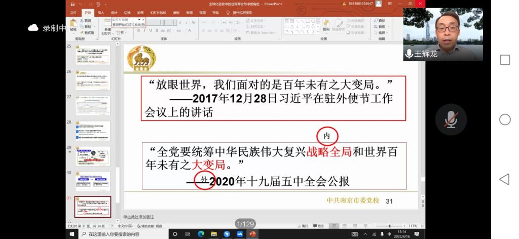 4月16日下午,南京市委党校市情研究中心主任王辉龙教授应邀于线上作了题为“全球化进程中的世界舞台与中国角色——从《共产党宣言》说起”的讲座。讲座由公司党总支副书记布丹丹主持,云顶国际yd222线路检测中心全体本科生、研究生参加了讲座。