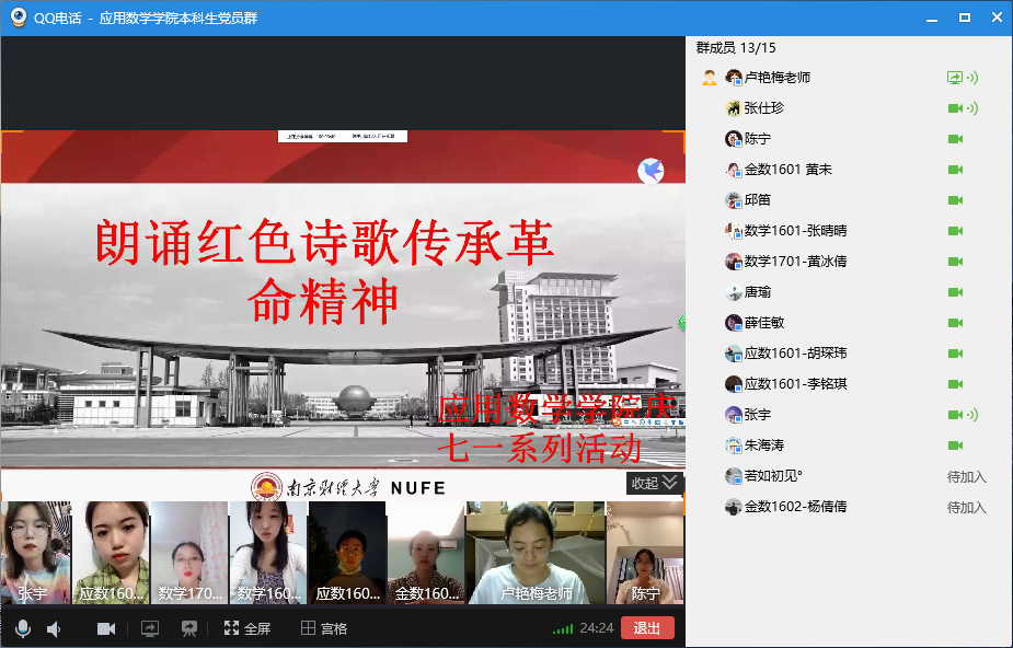 研究生党支部书记刘如玉带领支部党员朗诵了红色经典诗歌《党旗颂》。她说,“一个党员一盏灯,一个党员一面旗”,这是对党员的期望、要求,更是考验。我们应以党旗为标,党旗所指就是我们前进的方向,党员应坚定理想信念,无论处在什么环境,都应不忘初心,让党旗因为有我们更加光辉耀眼!