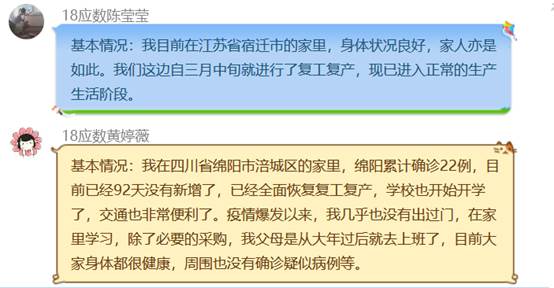 沈思敏同志:自从疫情爆发以来,家人一直遵守管理规定,极少出门。在家的这段时间我也没有丢掉学业,一直通过网课学习。目前安徽省已经解除了封闭式管理,正在积极恢复公共交通日常运营。父亲在疫情好转后开始上班,母亲只会偶尔出门购买生活用品,妹妹公司也已正常开学。目前,潜山市无确诊病例。