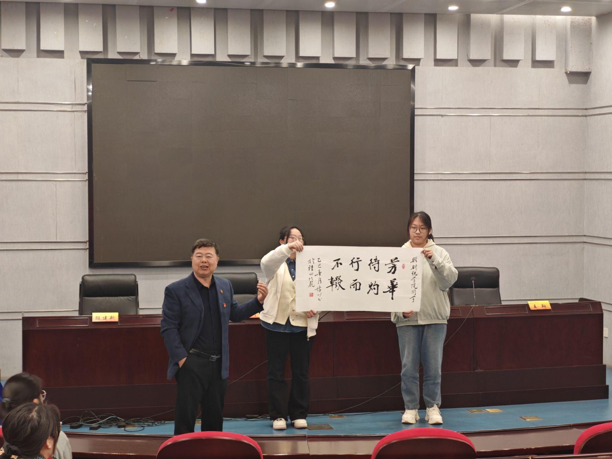 讲座最后,冯教授即兴唱戏曲《智取威虎山》中的经典片段“明知征途有艰险,越是艰险越向前”,鼓励学员们不畏艰险、明智笃行,并展示书法作品“不行待劳、辍而灼华”激励学员们要不负韶华,要登绝顶莫辞劳,为实现中华民族伟大复兴而奋斗。