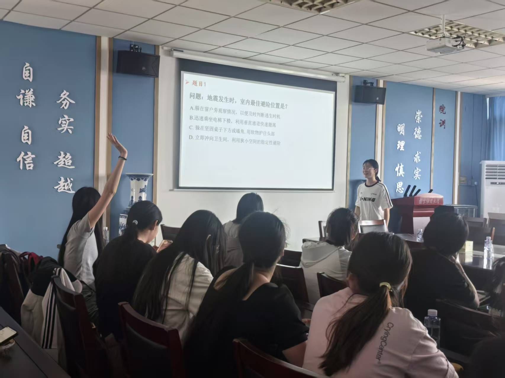活动在知识宣讲中拉开帷幕。研究生党支部员工书记李秋伊化身“安全科普使者”,通过图文并茂的讲解,系统剖析地震、台风、泥石流等自然灾害的成因,并重点围绕“科学避险”展开教学,从家庭急救包的物资清单到室内外避险的黄金法则,干货满满。互动问答环节中,同学们争相抢答,现场气氛热烈,在思维碰撞中深化了对防灾知识的理解与记忆。