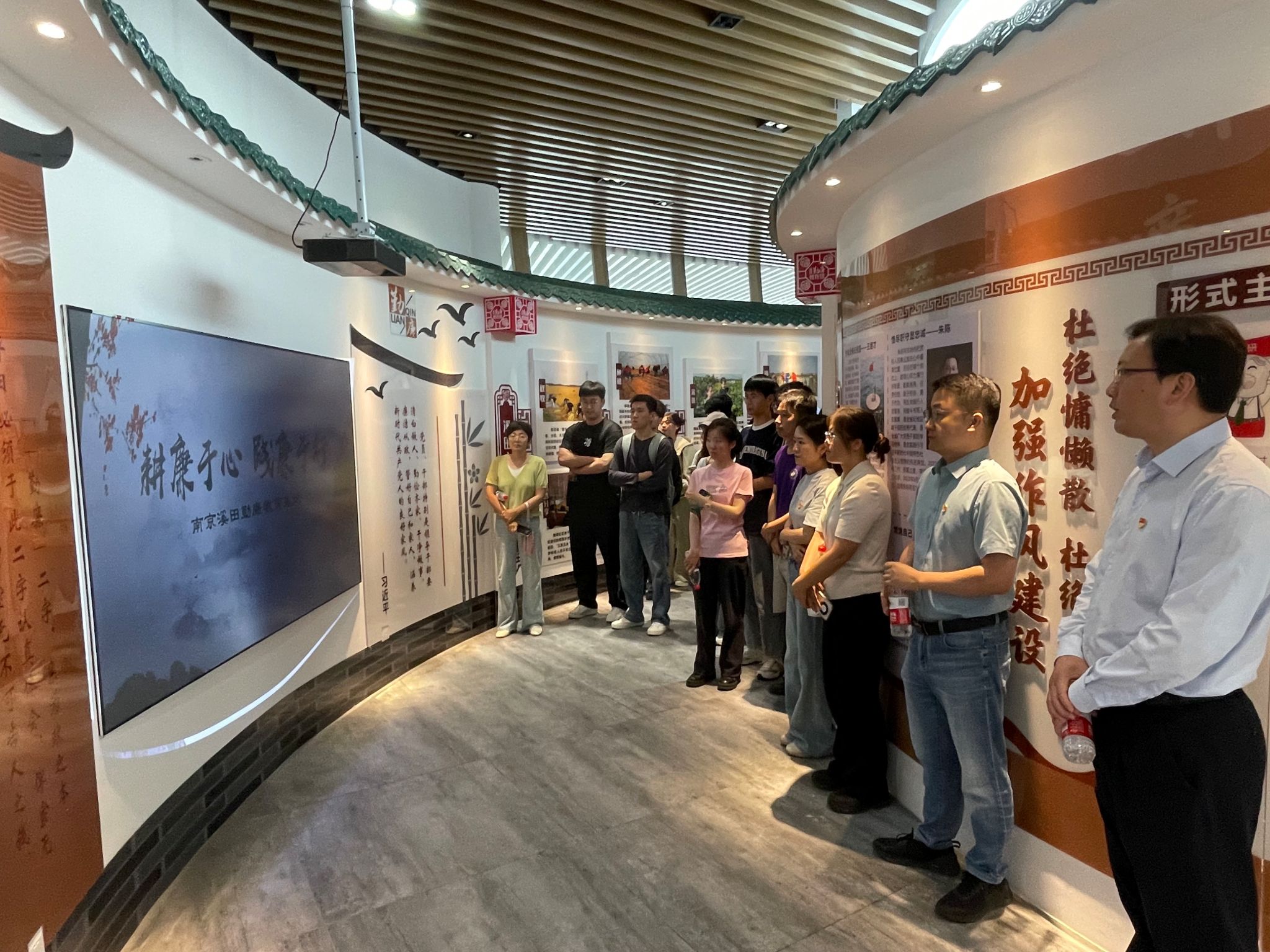 溪田勤廉教育基地特色鲜明,将红色教育、廉政文化与农耕文化深度融合,以“勤”廉”为主题进行精心布局。在勤廉教育馆内,讲解员通过详实的文字说明、生动的图片展示、感人的故事叙述,全方位地展现了老一辈革命家的廉洁风范,以及江宁地区清官廉吏的动人事迹。通过丰富多样的展示与叙述,讲解员引领大家深入学习和理解习近平总书记关于作风建设的重要论述,以及中央八项规定及其实施细则精神。党员们认真学习,对廉政文化内涵和党纪党规有了更为深刻的认识,青年党员深受勤廉文化浸染,廉洁自律意识得到进一步强化。在户外廉政参观点,“廉”文化与自然景观巧妙交融,廉政茶、竹、莲、松四组团使党员们在漫步过程中领悟到“茶、莲、松、竹” 的高洁品质与廉政内涵,达成了以景喻廉、以廉化人的教育效果。