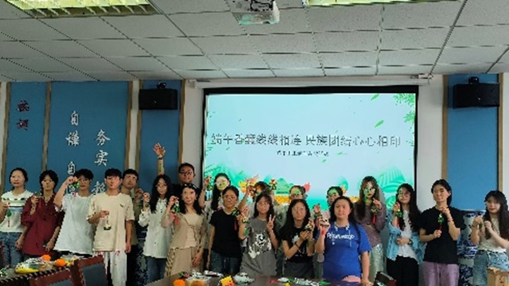 迎端午手工制作香囊活动中,与会老师和同学们一边看香囊制作视频,一边缝制、装艾叶、系彩绳,师生们相互协作、交流心得和想法,克服挑战,最终制成了一个个精美的香囊。小小的香囊里面塞满了艾草,更是对每个人的美好祝福。最后,兴致盎然的老师和同学们举着香囊合影留念。