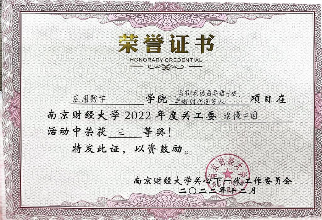 公司获得校关心下一代工作年度先进集体,“与柳老话百年奋斗史,争做时代追梦人”项目荣获校2022年度关工委“读懂中国”活动三等奖,杨宸宇同学作品《平凡中的伟大》获校2022年度关工委主题征文活动三等奖。