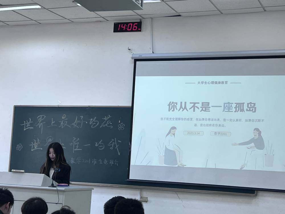 数学2201班“世界上最好的花,世界上唯一的我”主题班会以老员工心理健康为切入点,普及老员工常见的心理健康问题与矛盾的心理状况,并围绕这些问题向同学们介绍自我调适的方法。数学2101班“雷锋精神薪火传,青春志愿绽光彩”主题班会从几个关于雷锋的小故事中引出老员工传承弘扬雷锋精神的重要性并呼吁同学们向雷锋同志学习,让自己的青春绽放光彩。金数2201班“开学那点事”主题班会从开学注意事项开始,系统梳理了包括个人安全、期末考试、疫情防控等在内的开学重点工作,并为同学们合理规划时间提供建议。上述三个班级将代表公司参加校级评比。
