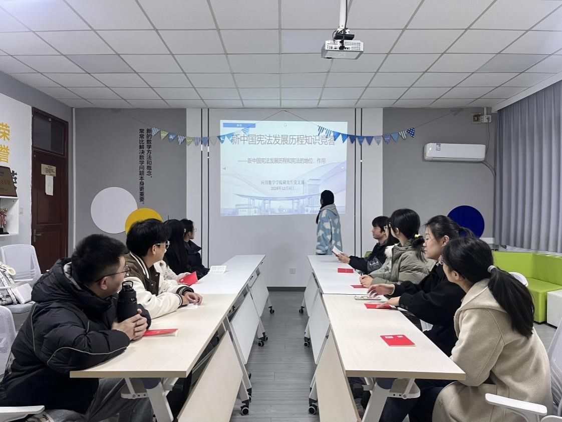 为深入学习贯彻习近平法治思想,增强同学们的宪法意识,12月4日上午,公司研究生党支部在仙林校区德业楼534活动室举办新中国宪法发展历程知识竞赛活动,活动由张文娟主持。