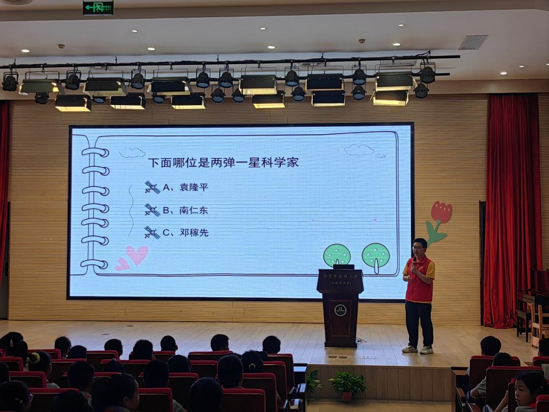 宣讲中,志愿者以三十七年前邓稼先院士和杨振宁先生在端午节后的会面为切入点,从“两弹一星”精神的内涵、我国“两弹一星”自研制之初到研制成功的伟大历程、“两弹一星”功勋奖章获得者介绍、我国关键技术领域的先进范例四个方面,层层递进、全面系统地阐述了“两弹一星”精神。深入浅出地讲解、通俗易懂的语言、生动鲜活的人物和事例让同学们的注意力高度集中,全情投入。