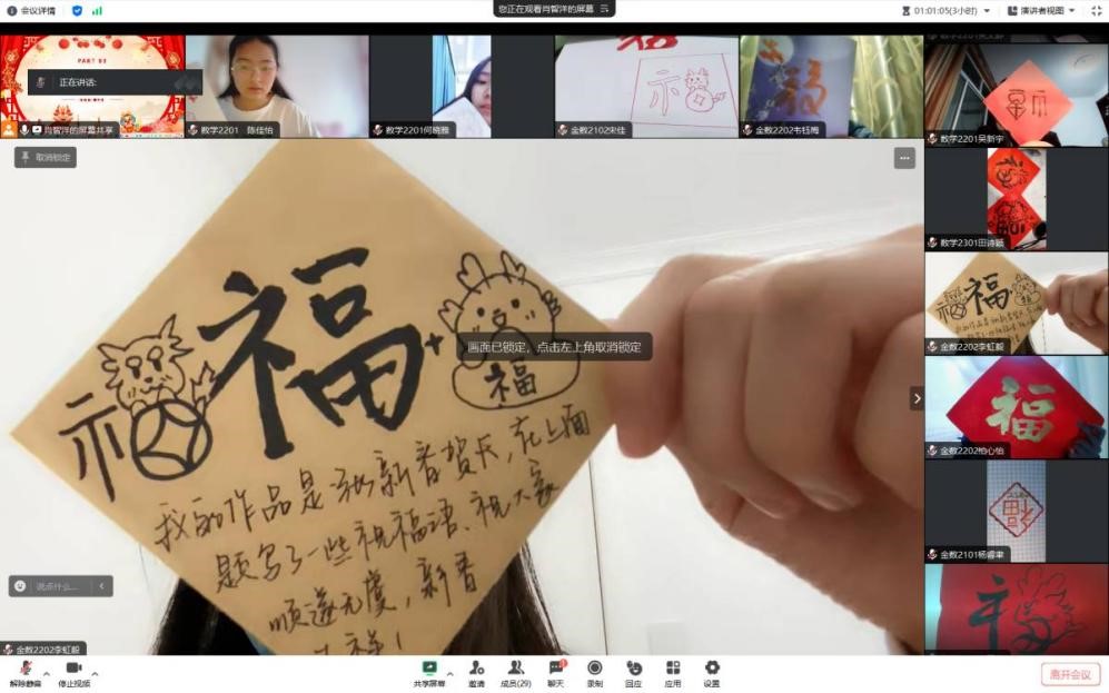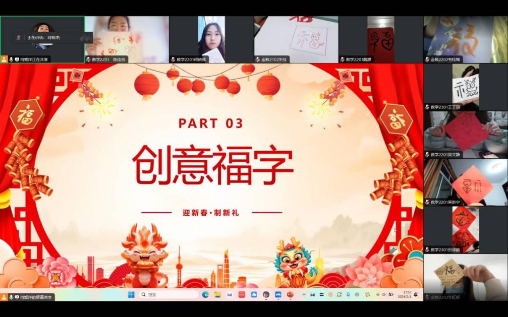 2月1日,公司以线上会议的形式进行迎新春作品展示。同学们相聚云端,纷纷在镜头前展示自己亲手制作的创意作品。有的同学笔酣墨饱亲手书写了寓意满满的春联;有的同学发挥巧思制作了祝福满满的新年贺卡;有的同学心灵手巧裁剪了温情满满的窗花;有的同学奇思妙想设计了创意满满的福字……大家在展示作品的同时,纷纷向同学和老师送上了最诚挚的新春祝福。