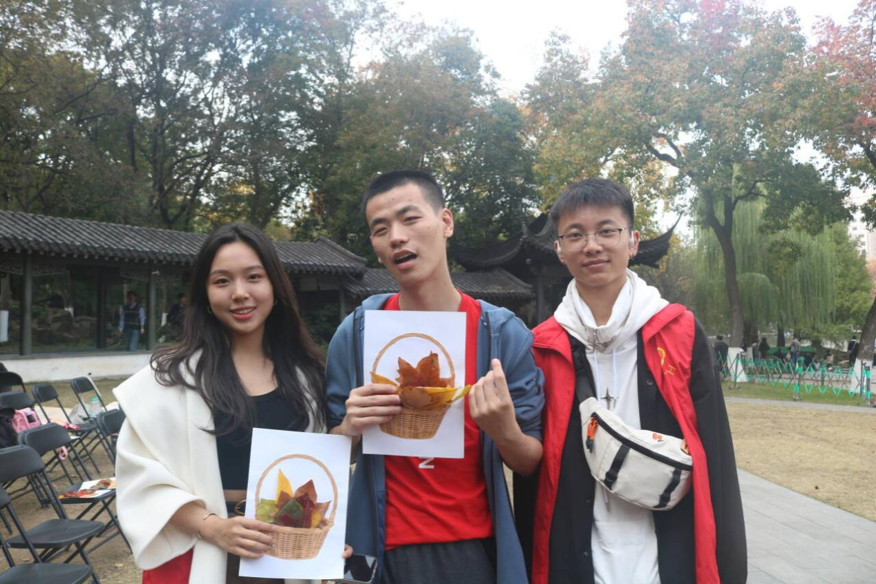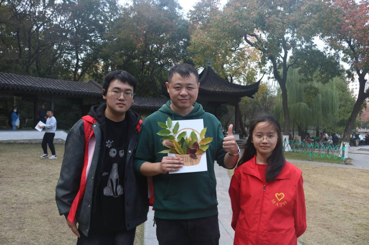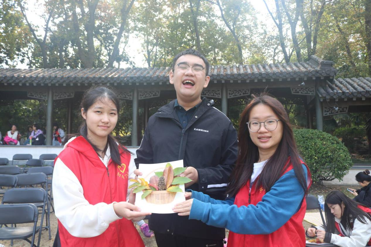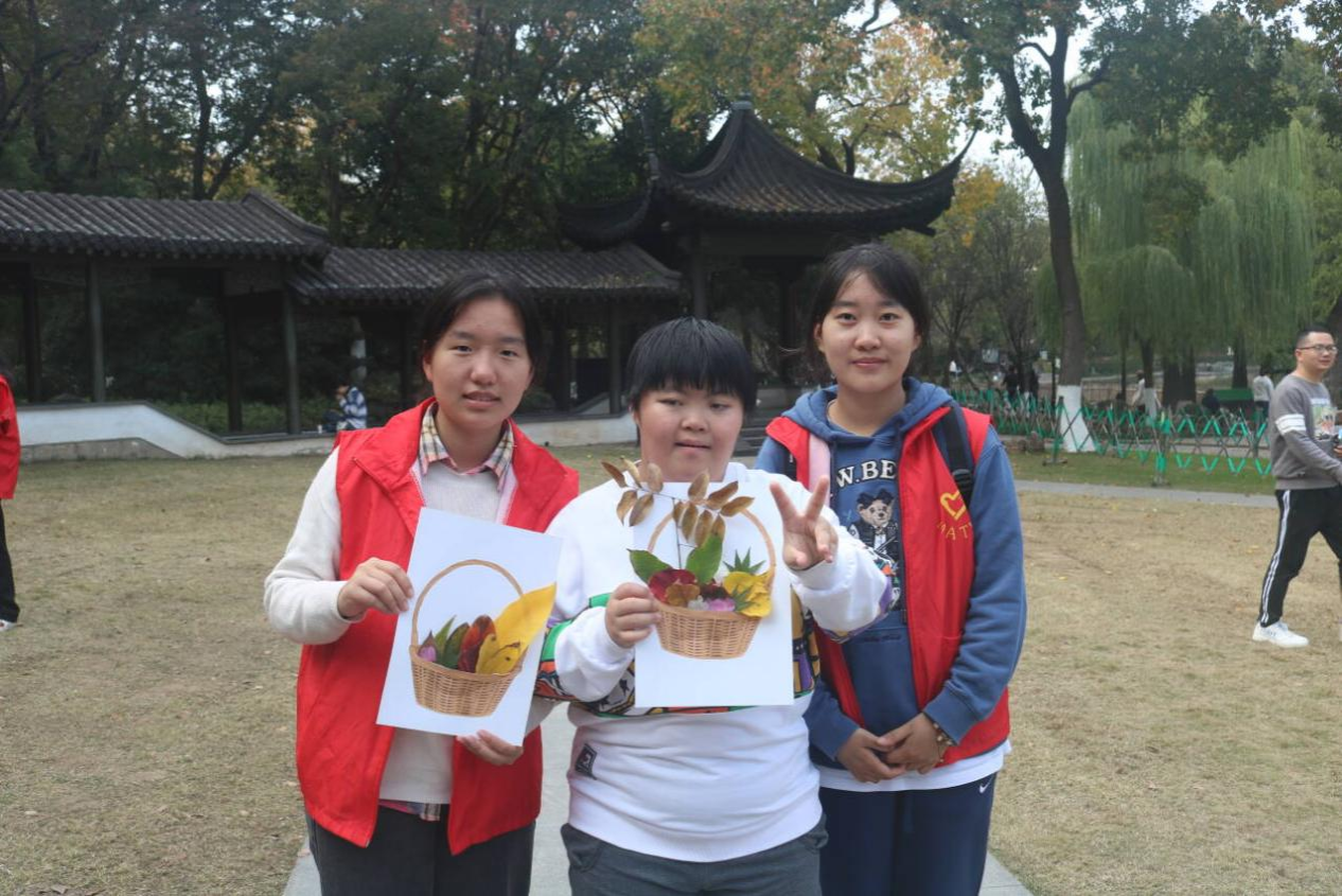 拾秋绘童趣,图画显缤纷。秋日之下的莫愁公园,充满着别样的色彩,树叶颜色从深绿到深红的渐变,是自然赐予我们的视觉盛宴。在拾秋作画环节,障碍人士在志愿者的陪伴下,拾起一片片各形各异、色彩不一的树叶组成趣味十足的画作,展现了他们心灵的纯净与美好。这个环节既使障碍人士走进自然,感受风景,又让他们融入社会环境中,感受到大家的关心和关爱。