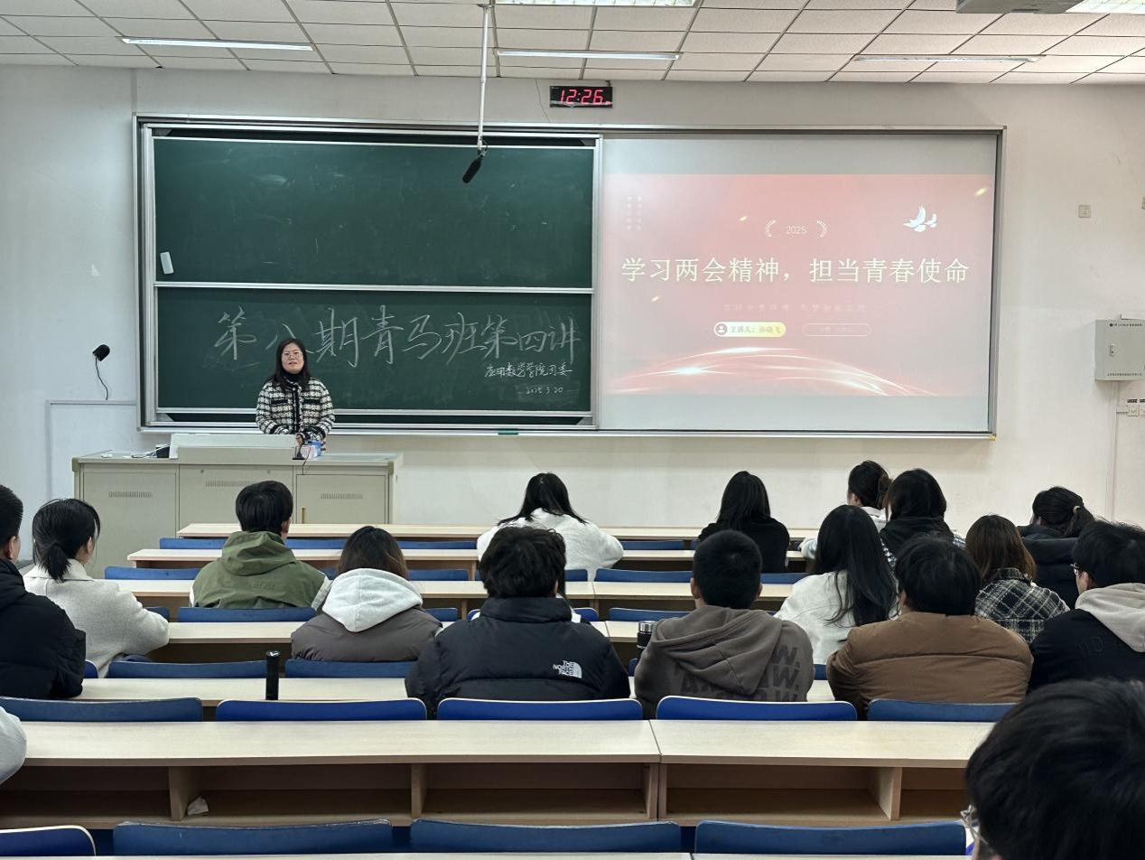 为深入学习贯彻两会精神,激励老员工担当青春使命,3月20日中午,公司第八期青马班第四讲“学习两会精神,担当青春使命”在仙林校区德正楼112教室举行。公司党委副书记孙晓飞老师主讲,公司全体青马班学员参加。