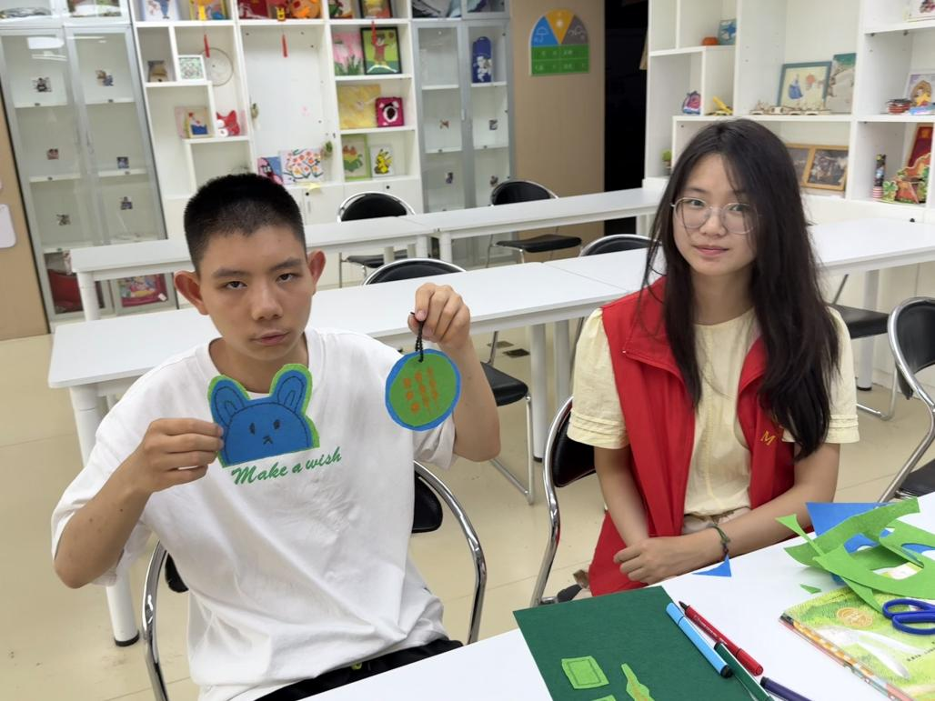 阅读环节结束后,绘画与手工创作随即展开。志愿者们和障碍人士一同拿起画笔,在画纸上肆意挥洒色彩,有人绘出尖顶的房子,有人勾勒出可爱的小动物,每一幅作品都饱含独特心意。制作不织布挂件时,志愿者耐心示范裁剪、缝制、装饰步骤,帮助障碍人士完成一个个精致小挂件,小小的手工物件,成为彼此情谊的寄托。