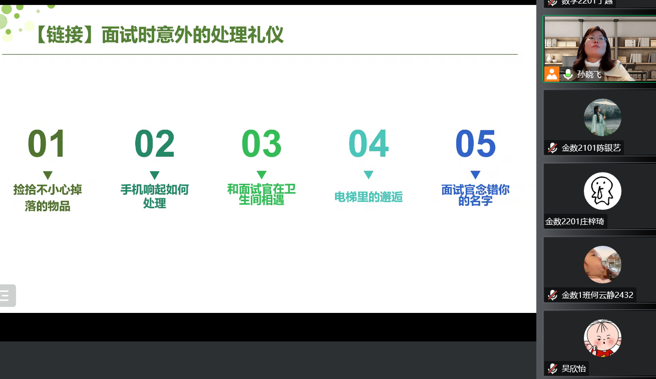 孙晓飞老师以分析面试成功案例切入话题,明确职场礼仪在面试中的重要意义,详细的介绍了职场服装的种类及颜色搭配方法,并针对如何塑造形象提出“恰当的举止、诚恳的态度、不凡的谈吐”等职场技巧都能成为加分项。她谈到,拥有阳光的心态,学会认识自己,悦纳自己,是从职场走向成功的重要一步。最后,孙老师现场回答了同学们在求职中遇到的一些突发问题的解决方法。