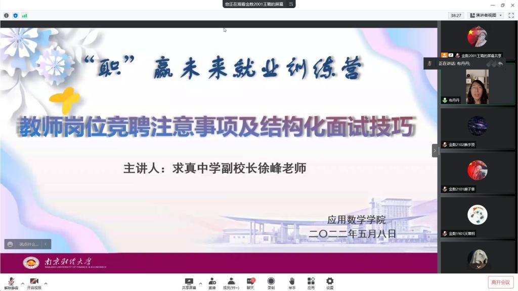 5月8日晚,云顶国际yd222线路检测中心开展“职”赢未来就业训练营讲座,邀请求真中学副董事长徐峰作关于教师岗位竞聘注意事项及结构化面试技巧的线上讲座。公司18级、19级本科生及全体研究生参加讲座,讲座由公司党总支副书记布丹丹主持。