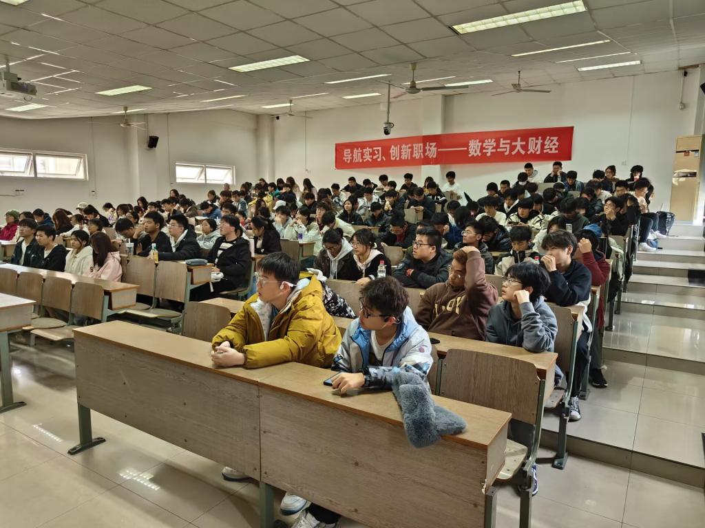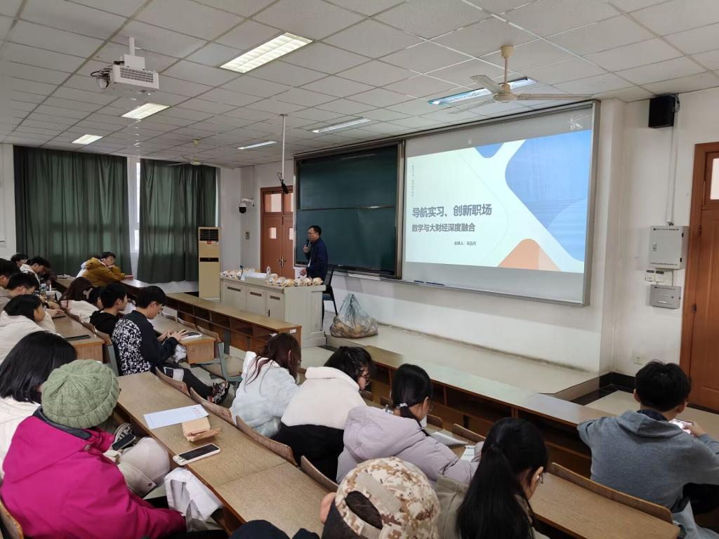 之后,马五代总经理作了题为“导航实习、创新职场——数学与大财经”专题讲座。他分享了自己毕业后就业面临的挑战以及15年坚守创业初心的行业经验,并以自己和同窗的老员工涯和发展轨迹告诉同学们,大学首要任务是学好专业,专业能力是核心竞争力,在此基础上,要注重实践经验的积累和沟通能力的培养。接着,他以自动驾驶和人工智能引发的失业危机等实例指出学习生涯和职业道路上并存的不同危机和机遇,强调认清自己、多学习多试错的重要性,并详细介绍了不同行业和领域的优势及挑战。最后,他再次强调,同学们应脚踏实地,拥有自己的想法和规划。